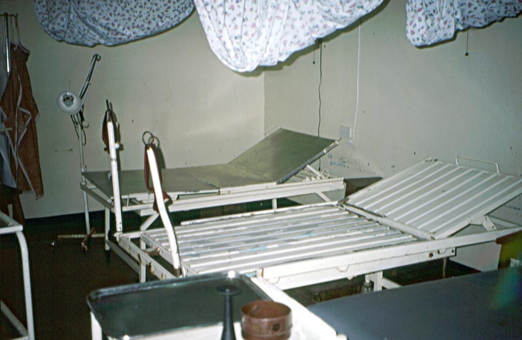| Der Kreissaal bzw. die gynäkologischen Untersuchungsstühle. Plastik-Matratzen gab es allerdings schon noch. Vorne in der Mitte sieht man das Hörrohr zum Auskultieren der kindlichen Herztöne (ein CRG gibt es nicht). Als bei der Lampe hinten mal die Glühbirne kaputt ging ließ sich weit und breit kein Ersatz auftreiben, sodaß man die gynäkologischen Untersuchungen halt mit der Taschenlampe machen mußte. |